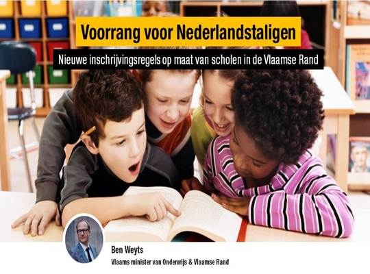 Vlaams minister van Onderwijs Ben Weyts heeft nieuwe inschrijvingsregels uitgewerkt op maat  van scholen in de Vlaamse Rand. Scholen van het basisonderwijs krijgen in de Vlaamse Rand de  mogelijkheid om voorrang te geven aan kinderen uit de eigen gemeente. Scholen van het  secundair onderwijs zullen in de Rand dan weer 70% van de beschikbare plaatsen kunnen  voorbehouden voor leerlingen die in het verleden altijd gekozen hebben voor Nederlandstalig  onderwijs. De Vlaamse Regering zal vastleggen welke gemeenten deze extra mogelijkheden  krijgen. “Specifieke uitdagingen vragen een specifieke aanpak”, zegt Weyts.